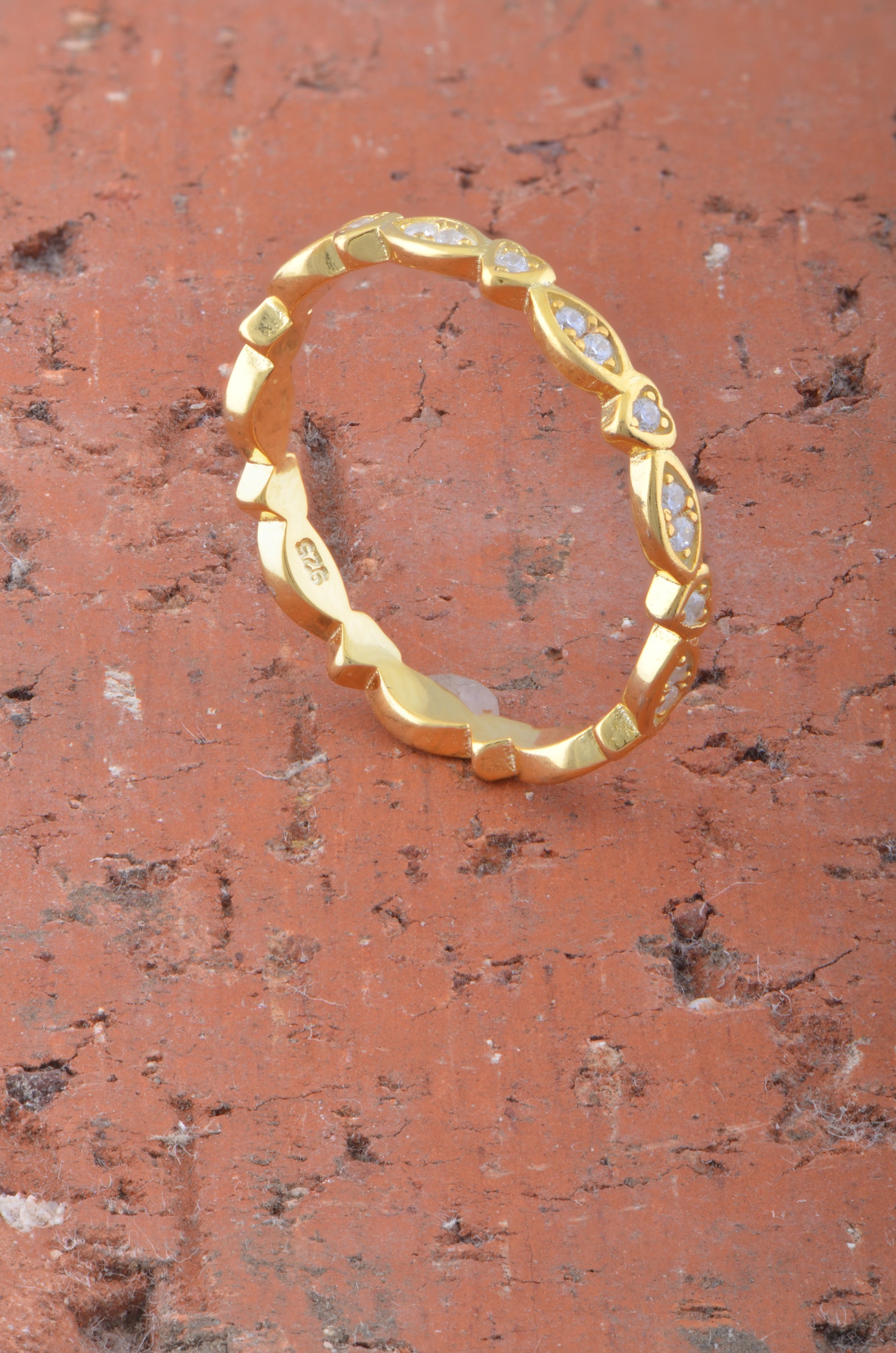 The Yellow Gold Over Sterling Silver Women's CZ Heart Eternity Band Stacking Ring is a beautiful way to celebrate love and add a touch of romance to your everyday style. This ring combines a stunning design with high-quality craftsmanship, making it a treasured keepsake for years to come.