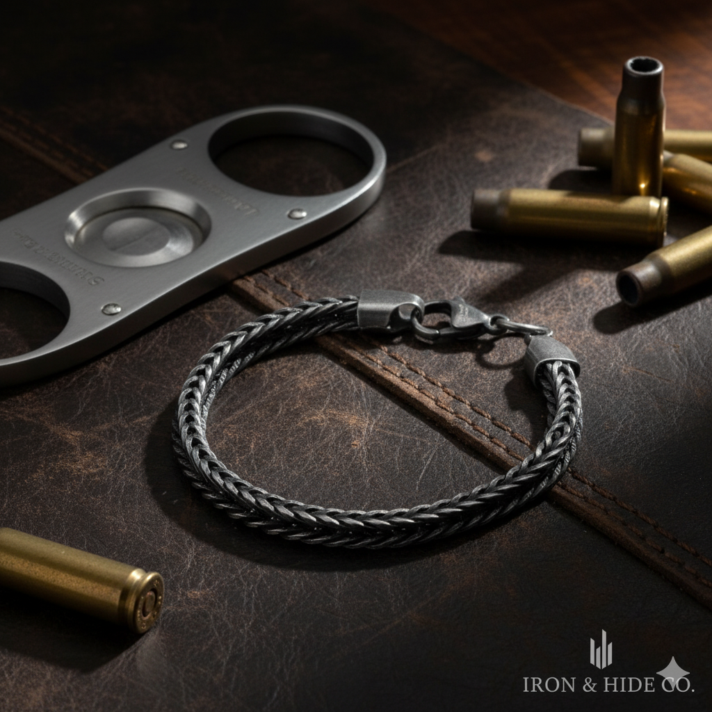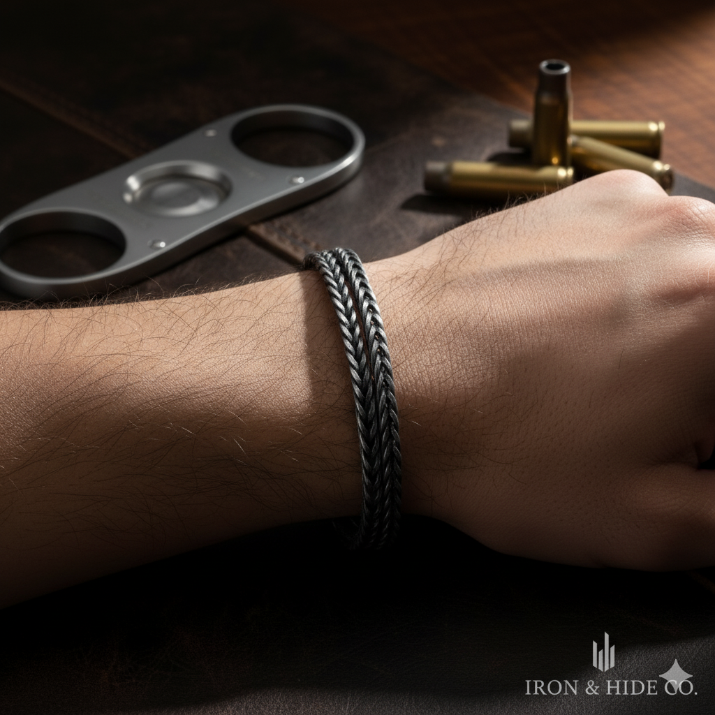 Adorn your wrist with this handcrafted Black Steel Flat Spiga Bracelet, exhibiting a seamless blend of style and expert craftsmanship.
