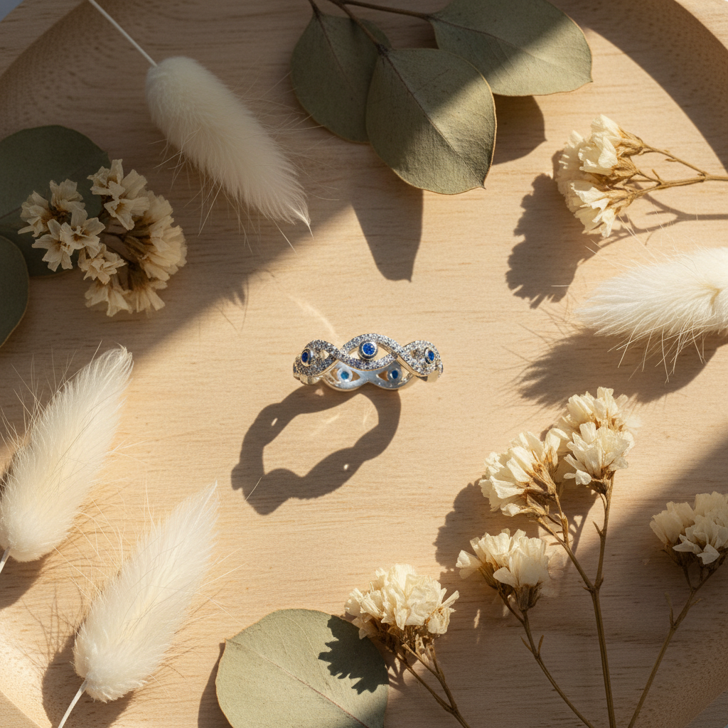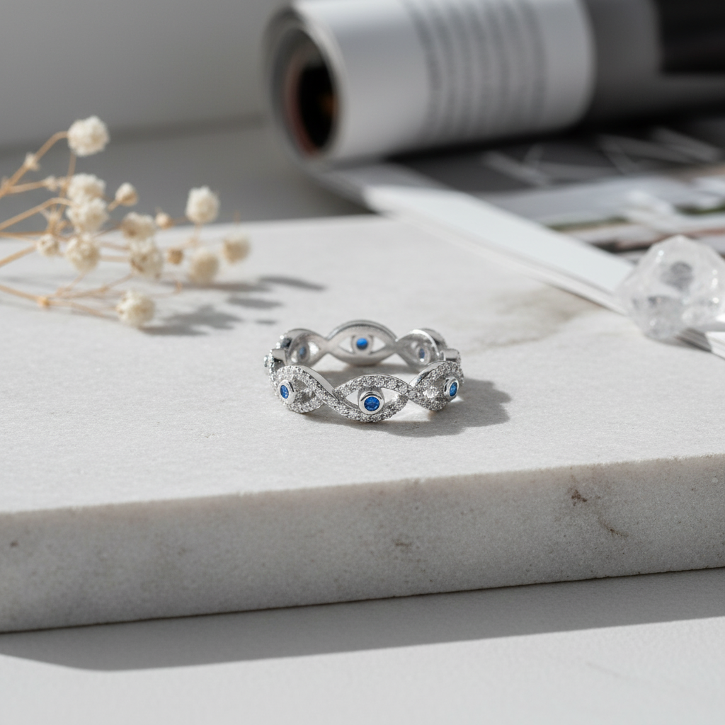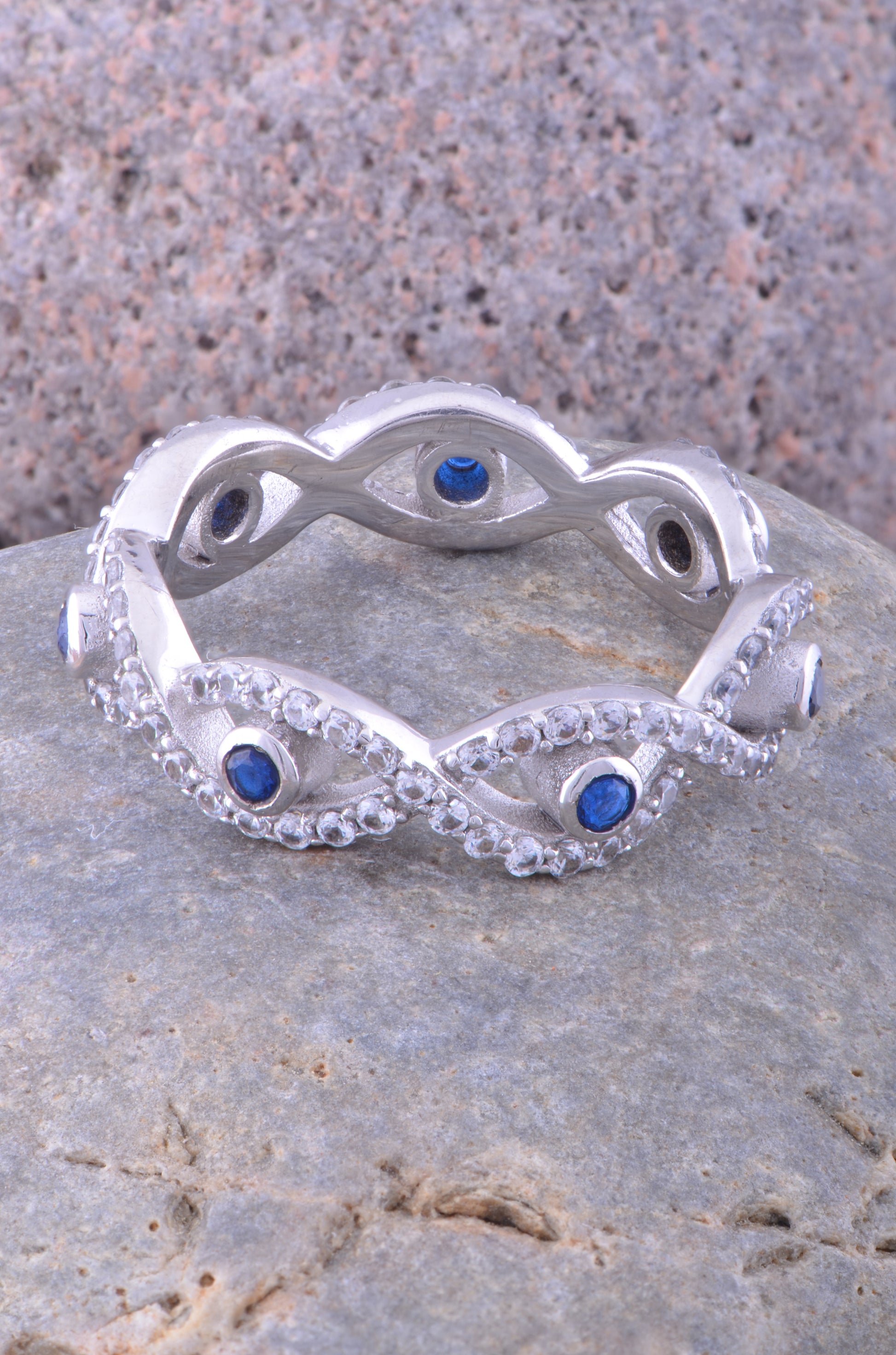 - Features round cubic zirconia and simulated sapphire stones in an evil eye eternity design.