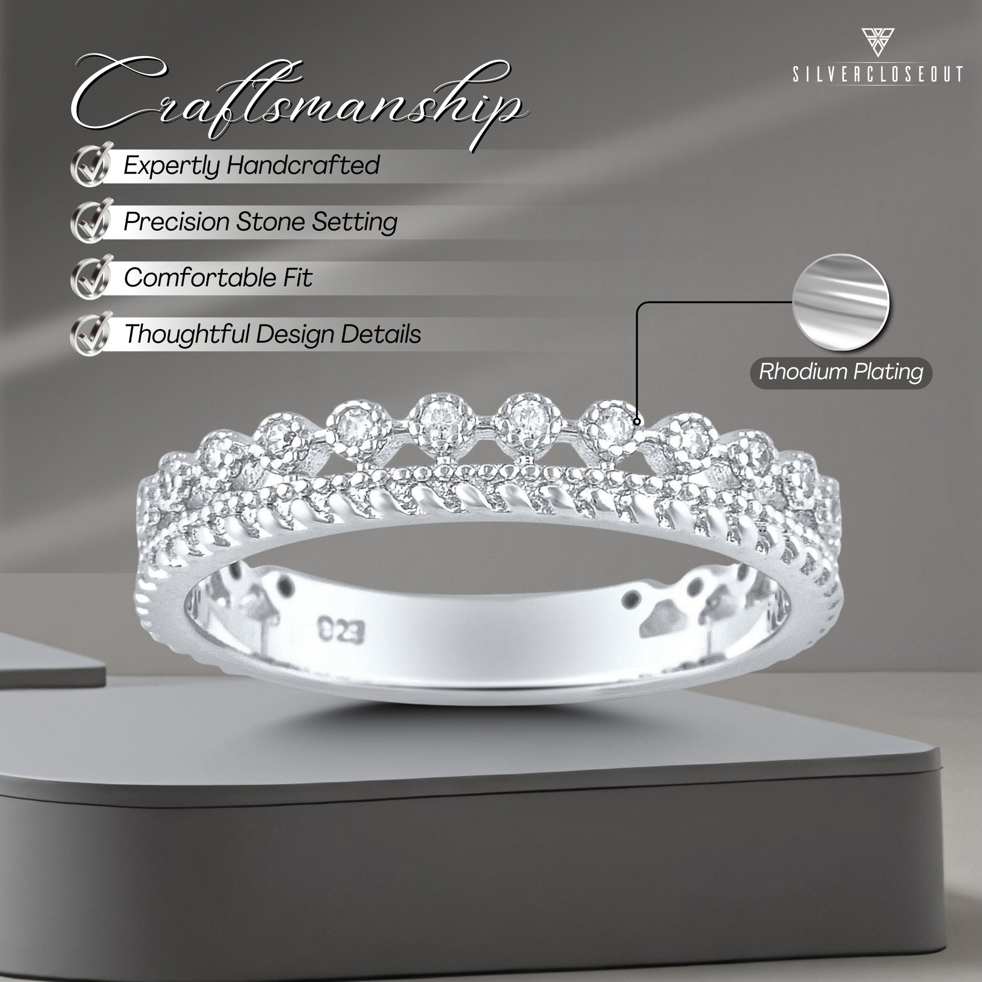 The double row of CZ stones adds an extra layer of brilliance, making this band a timeless piece that complements any outfit. The rhodium plating ensures a long-lasting shine and durability, while the thin design offers a comfortable and elegant fit. Each Rhodium Plated Sterling Silver Women's Thin Double Row CZ Eternity Band comes beautifully packaged in a gift box, making it an ideal present for anniversaries, birthdays, holidays, or any special event.