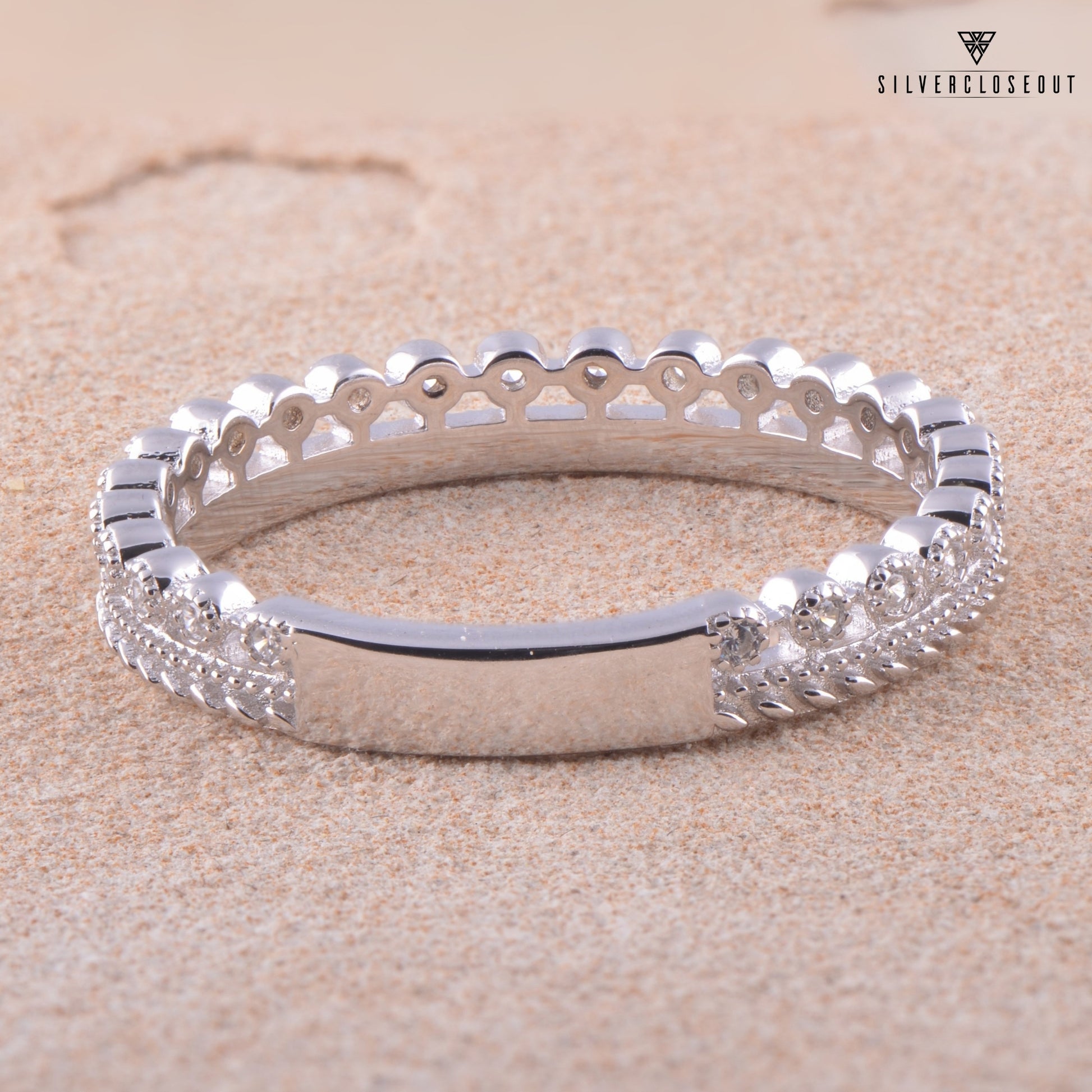The Rhodium Plated Sterling Silver Women's Thin Double Row CZ Eternity Band is a beautiful way to celebrate your enduring love and commitment while adding a touch of elegance to your everyday style. This ring combines a stunning design with high-quality craftsmanship, making it a treasured keepsake for years to come.