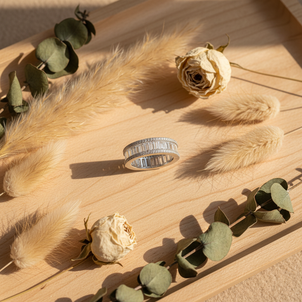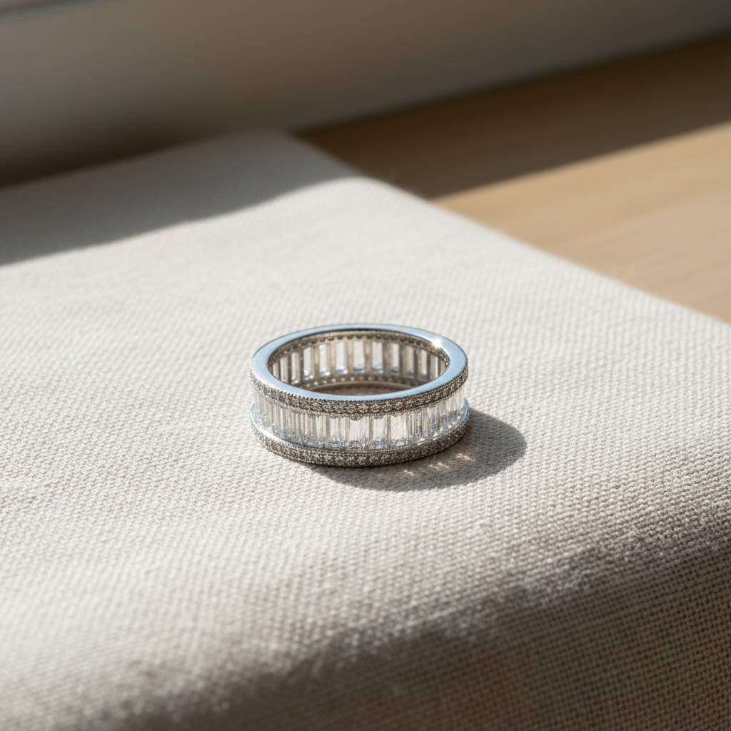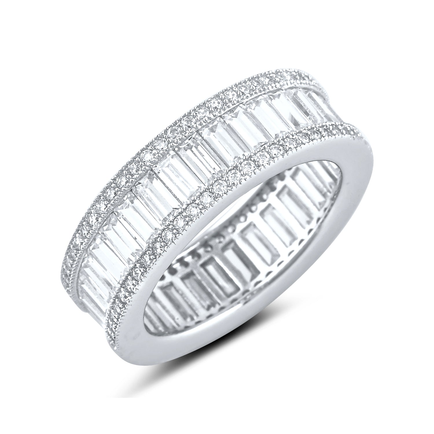 - Design: Wide eternity ring with baguette and round cubic zirconia (CZ) stones