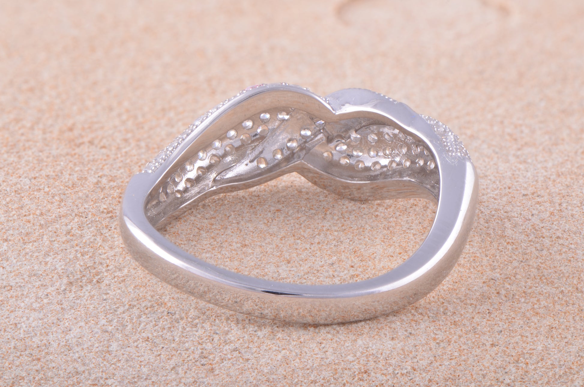 - Design: Twisted band with round cubic zirconia (CZ) stones