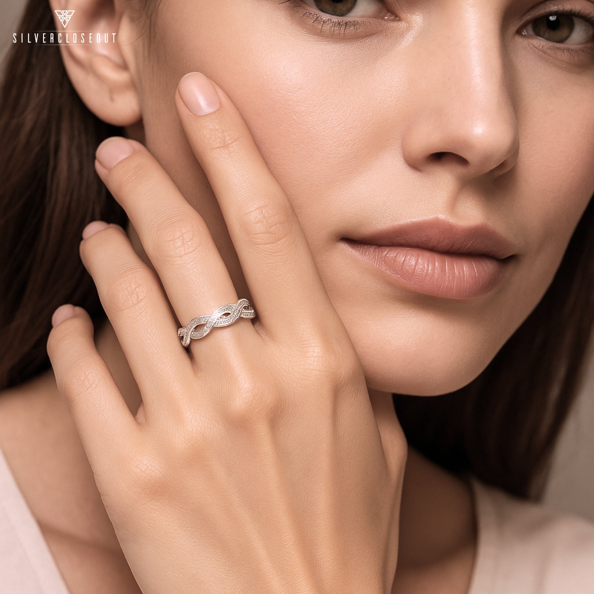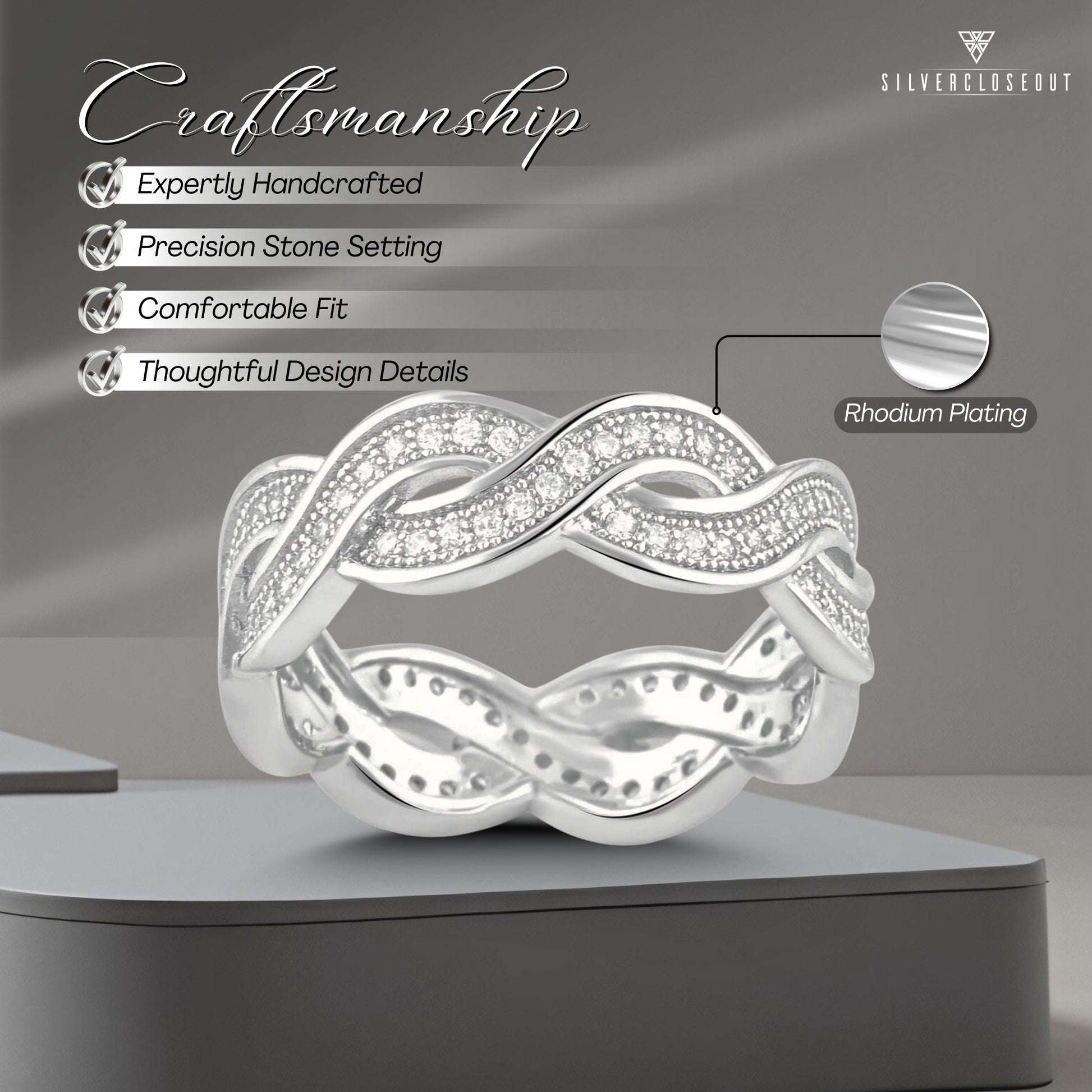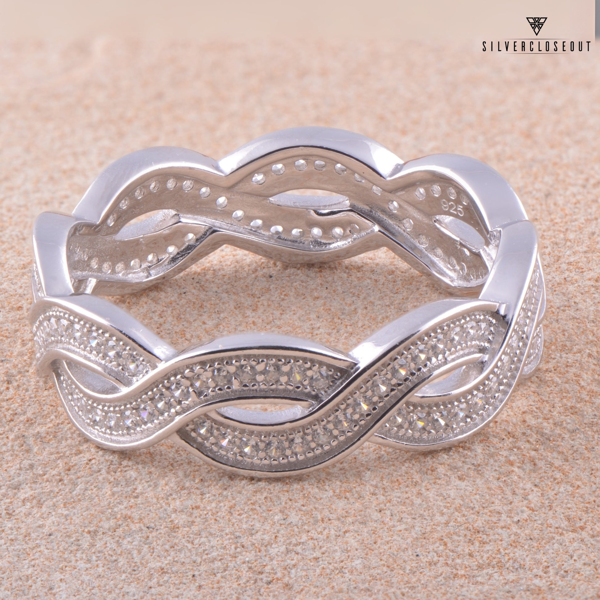 - Design: Wide twisted eternity band with round cubic zirconia (CZ) stones